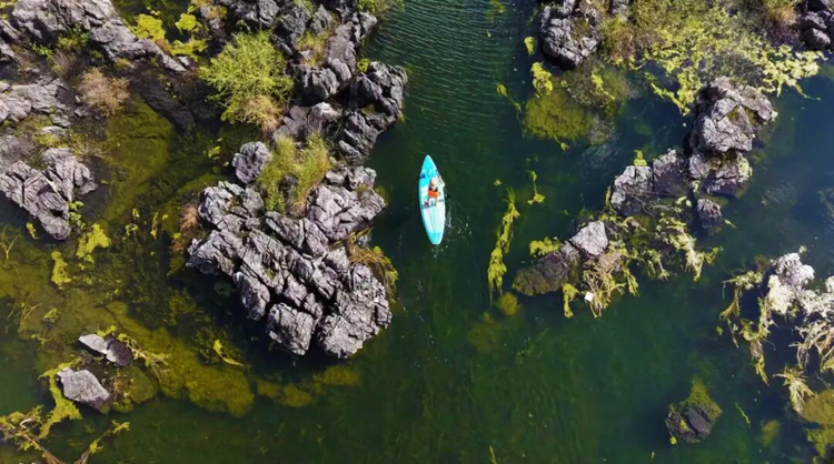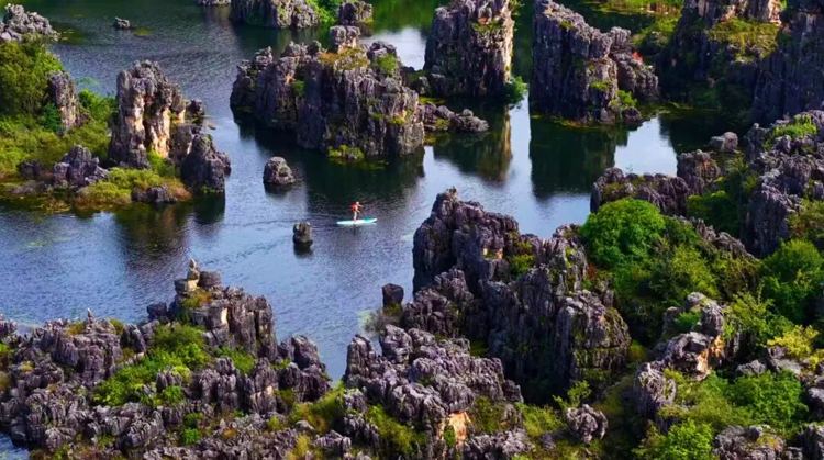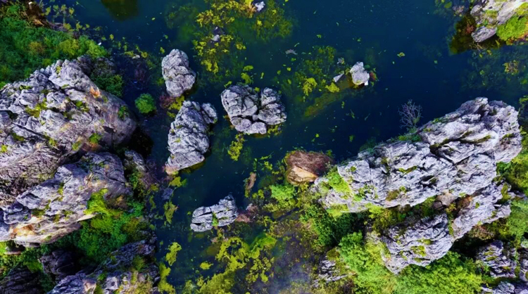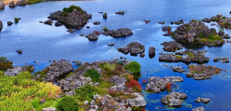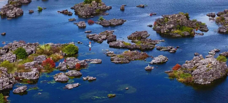 石芽群特寫機位:往湖的西側走,有一片露出水面的石芽群,石縫裏長著野草和小野花,蹲下來用低角度拍攝,能拍出“石芽從水中生長”的層次感,搭配遠處的村落屋頂,畫面更有生活氣息。